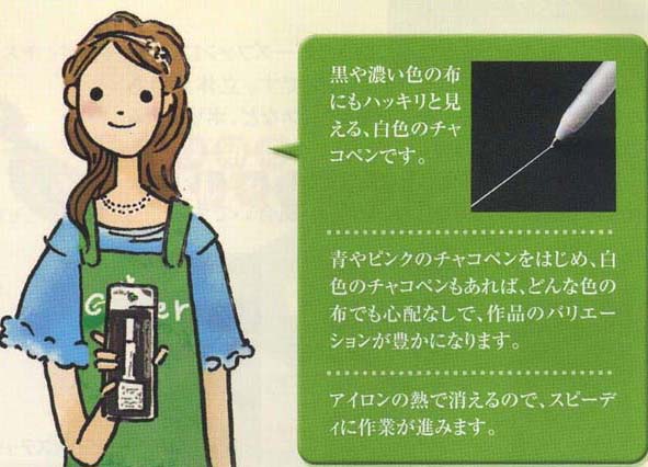 アイロンチャコペンはインクが白く発色しますので、黒布や濃い色の布でもしるしが見えます。