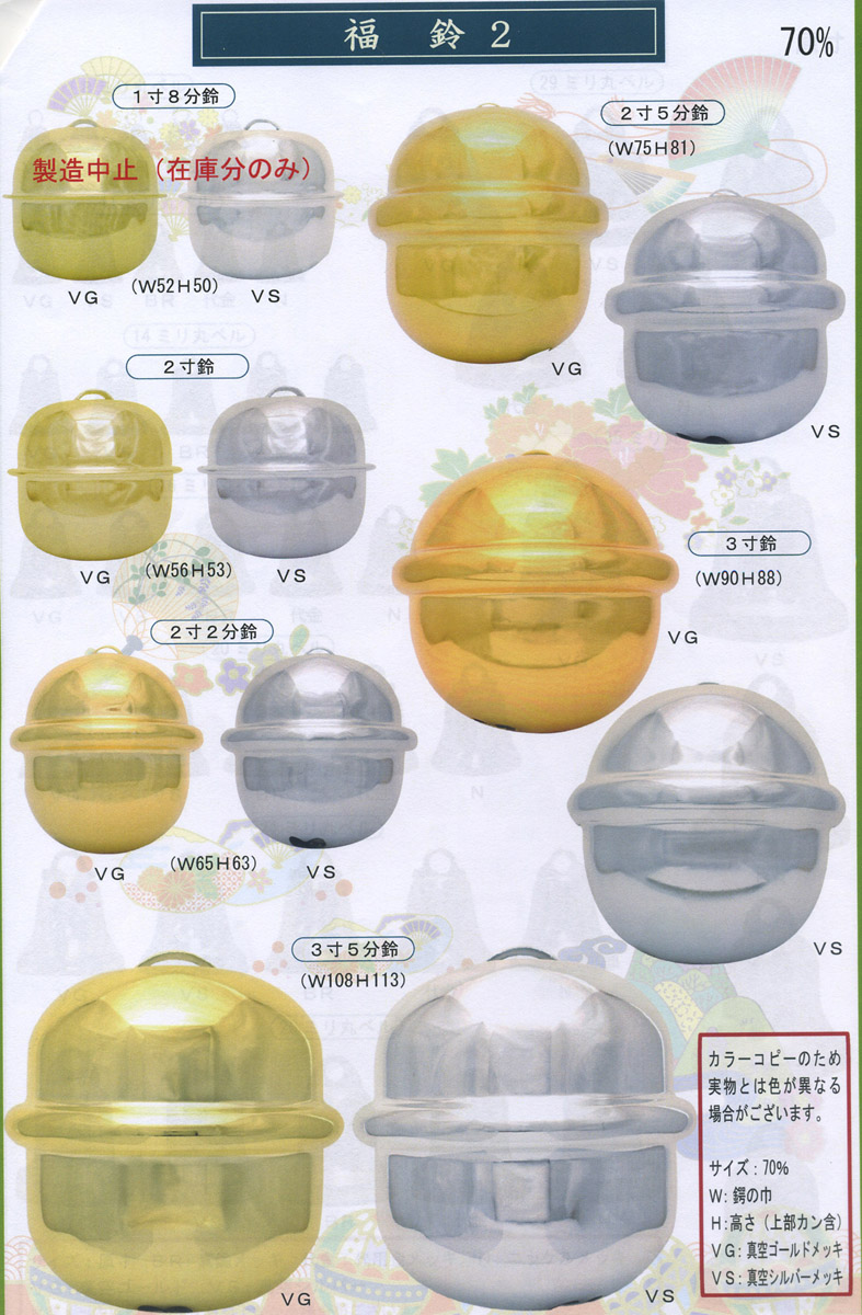 日本の鈴の代表的なパターンの福鈴の1寸以上の真空メッキタイプを10個単位で割安な価格で販売します。