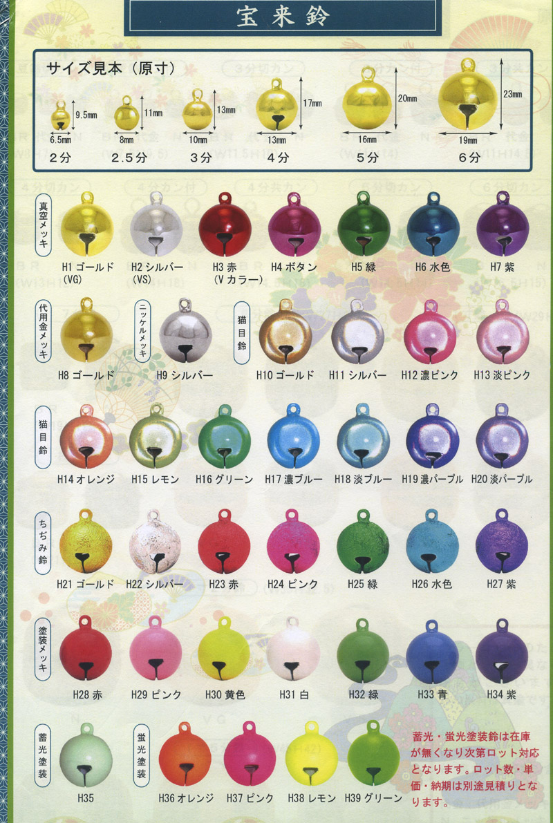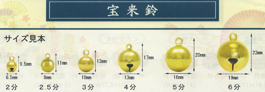 日本の鈴の代表的なパターンの福鈴と宝来鈴ここでは真ん中につなぎ目のない宝来鈴の各サイズを100個単位で割安な価格で販売します。<