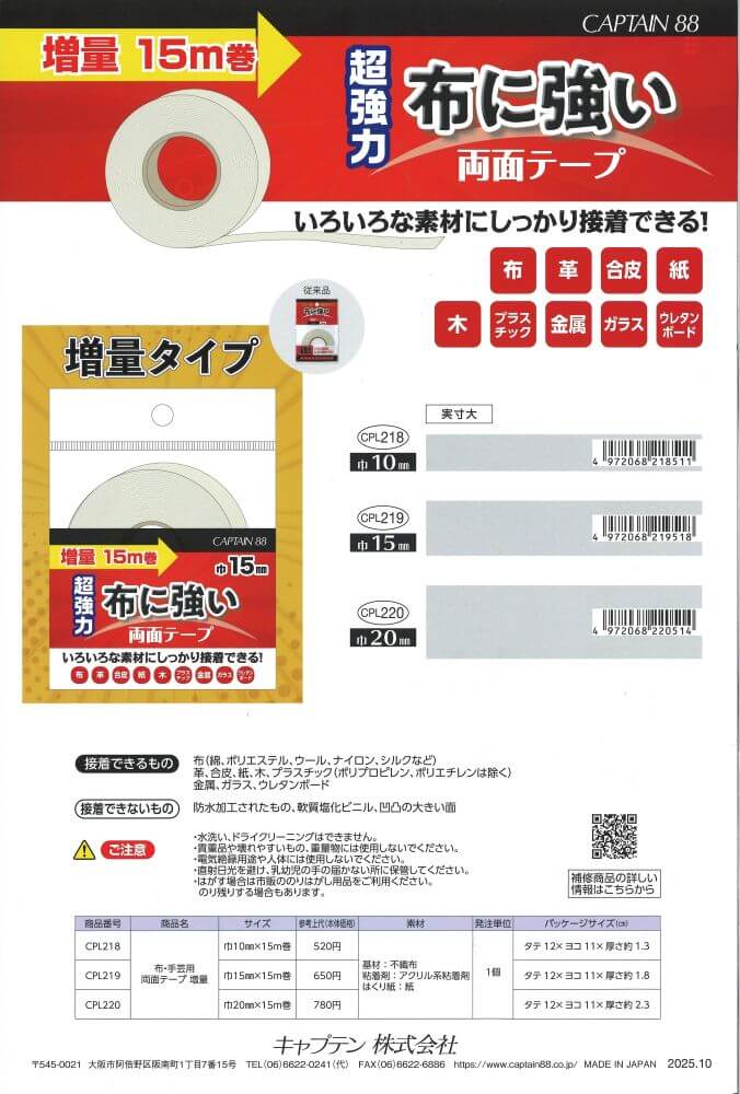 キャプテン 布に強い両面テープ 増量 巾20mm×15m巻 CPL220 1個単位 商品詳細