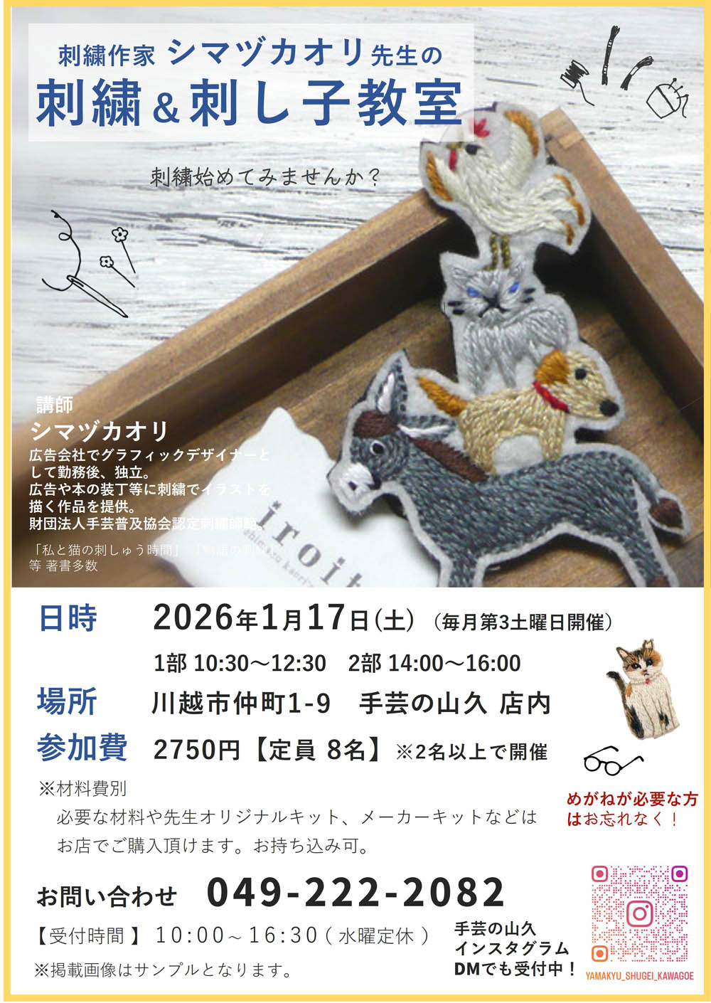 シマヅカオリ先生は、鎌倉と川越で『IROITO刺繍教室』を開催し、著書も多数出版されている刺繍作家の先生です。
